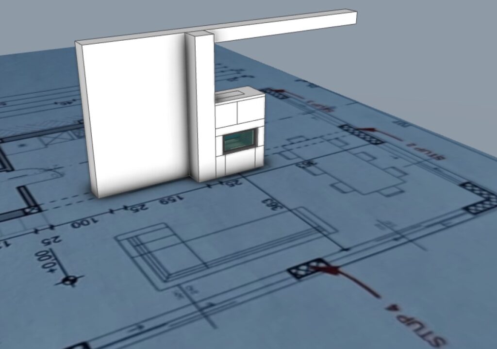 1. Skizze & 3D-Modell des Kamins – Darstellung des Austroflamm Tunnel-Brennraums 75×39 im 3D-Projekt­modell des Hauses auf Pag.