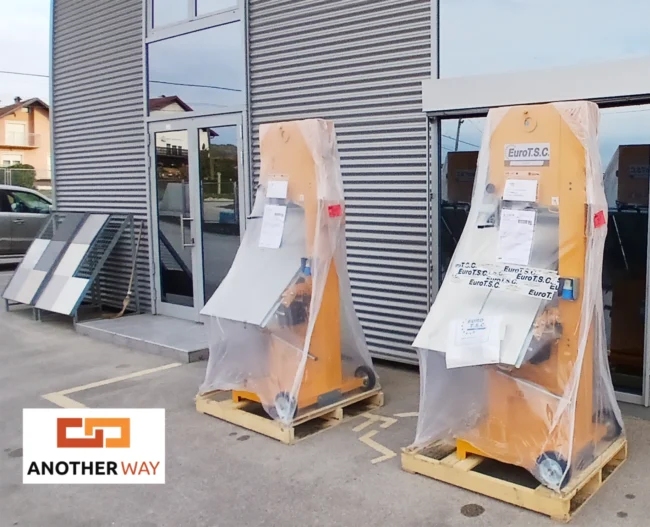 Für ihre Versetzung besitzt die Maschine ein Räderpaar und eine Deichsel, die den einfachen Transport der Maschine durch eine einzelne Person ermöglichen.